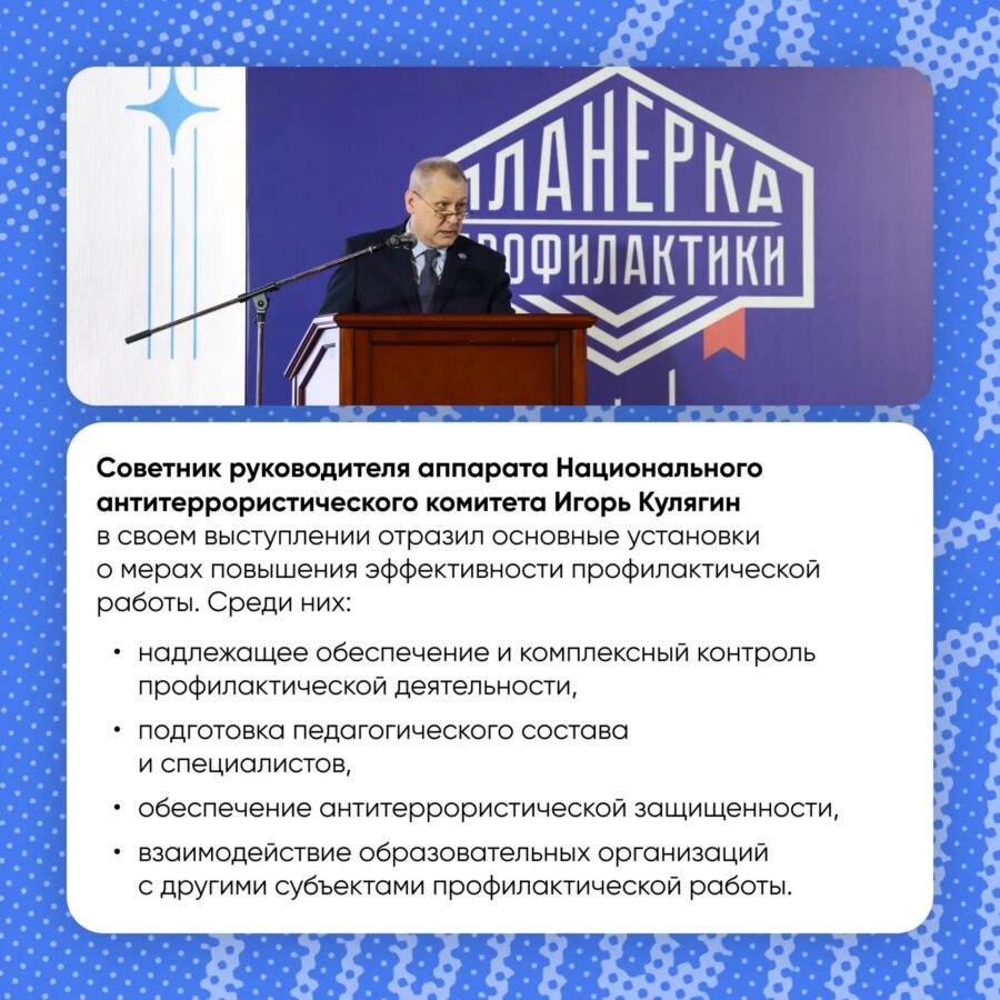 Советник руководителя аппарата Национального антитеррористического комитета Игорь Валерьевич Кулягин в своем выступлении отразил основные установки о принятии новых мер повышения эффективности профилактической работы, в том числе по надлежащему обеспечению и комплексному контролю профилактической деятельности, подготовке педагогов и специалистов, обеспечению антитеррористической защищенности, взаимодействию образовательных организаций с федеральными ведомствами.
