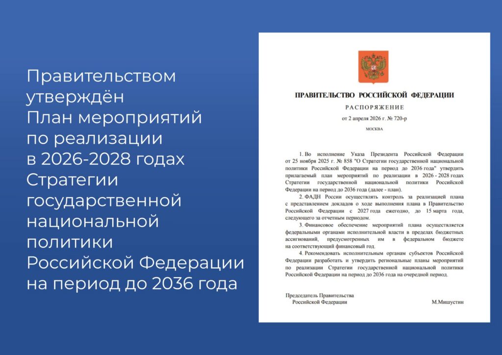 Во исполнение Указа Президента Российской Федерации от 25 ноября 2025 г. № 858 «О Стратегии государственной национальной политики Российской Федерации на период до 2036 года» распоряжением Правительства Российской Федерации от 2 апреля 2026 г. № 720-р утвержден План мероприятий по реализации в 2026 — 2028 годах Стратегии государственной национальной политики Российской Федерации на период до 2036 года.