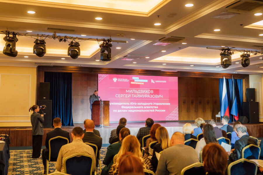 С приветственным словом от имени руководителя Федерального агентства по делам национальностей Игоря Баринова к участникам форума обратился и.о. руководителя Юго-западного управления ФАДН России Сергей Мильдзихов: