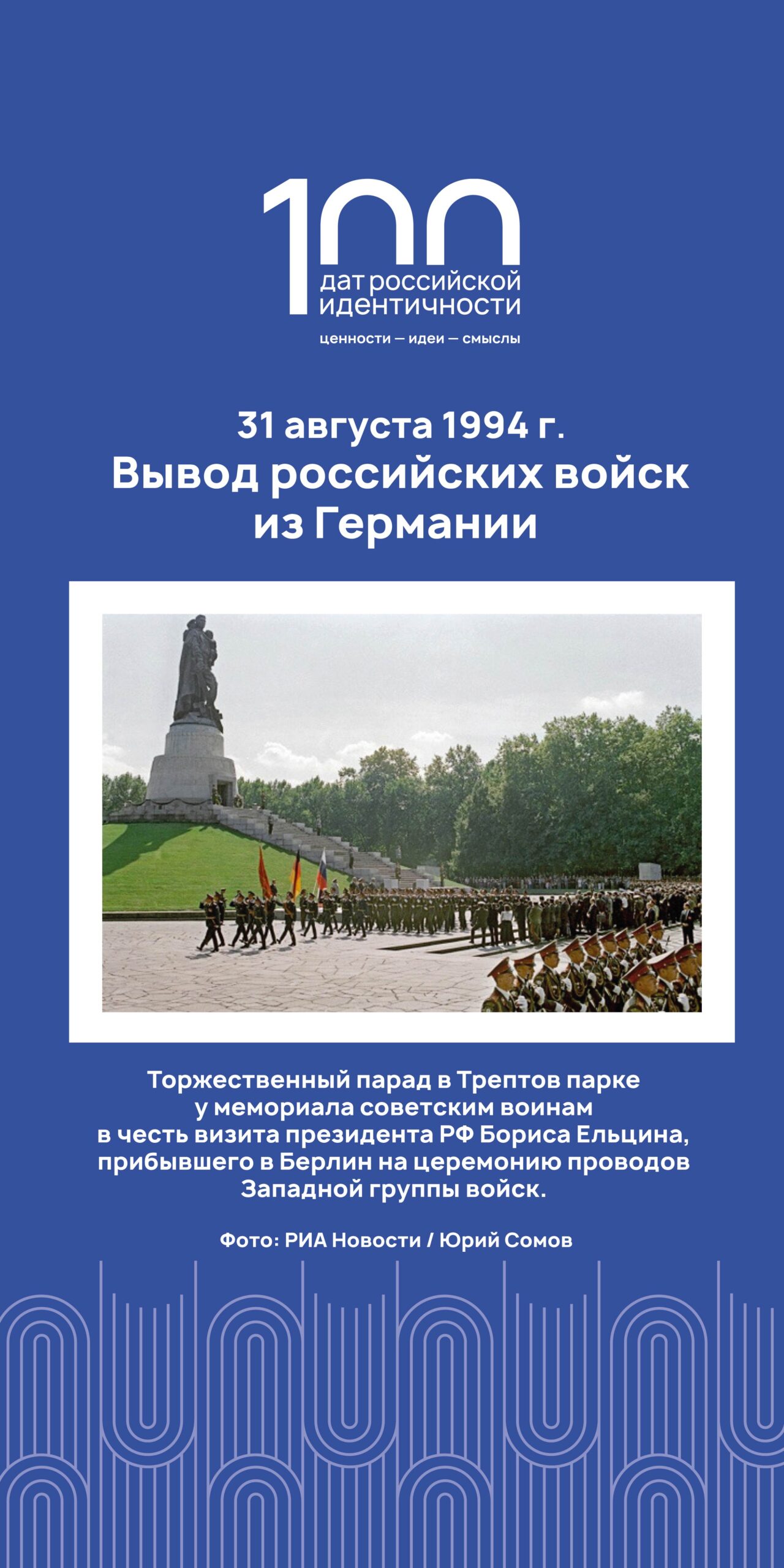 31 августа состоялся прощальный парад перед монументом советскому воину-освободителю в Трептов-парке в Берлине, на котором присутствовали президент России и канцлер Германии. Президент Б.Н. Ельцин выразил уверенность, что этот день войдет в историю «и России, и Германии, и всей Европы», а «достигнутое в процессе вывода войск взаимное доверие и понимание — важнейший вклад в их становление».
